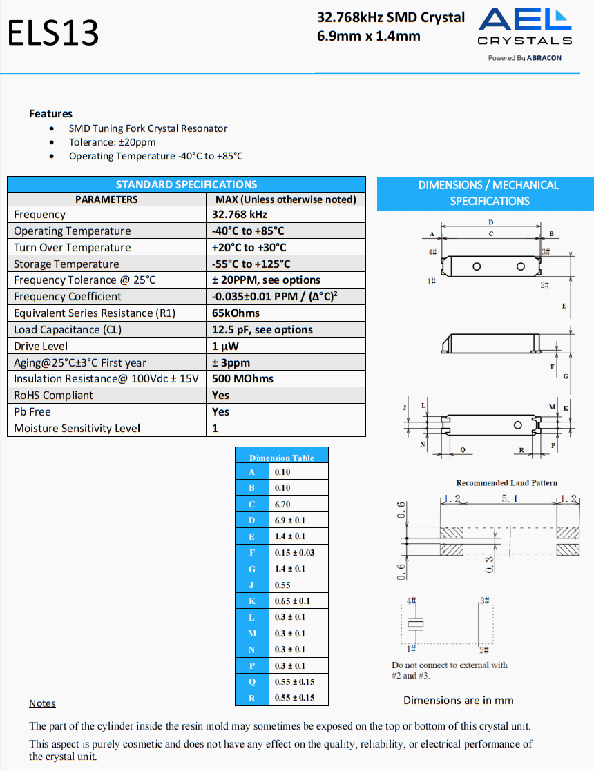 | ELS13-32.768kHz-7-T | AEL Crystals | ELS13 | 32.768 kHz | 0 | ±20ppm | 7 pF |