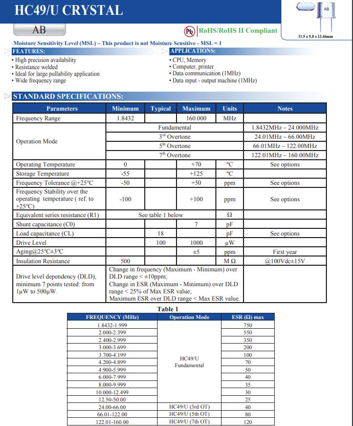 | AB-1.8432MHZ-B2 | Abracon晶振 | AB | 1.8432MHz | ±100ppm | ±20ppm | 18pF |