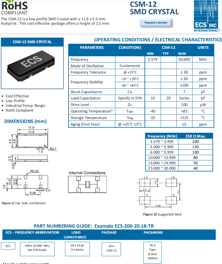 | ECS-120-S-18-TR | ECS Crystal | CSM-12 | 12MHz | -40°C ~ 85°C |