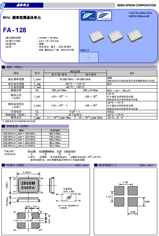 | Q22FA12800011 | 2 x 1.6 x 0.5mm | FA-128 | 26.000000 MHz | 10 pF | -20 to +75 °C |