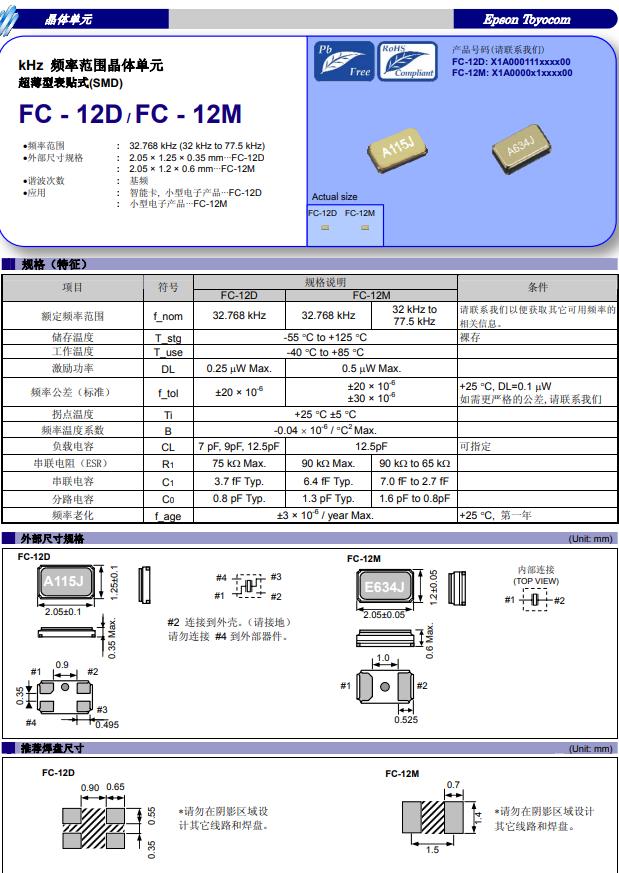 | X1A000061003500 | 2.05 x 1.2 x 0.6 mm | FC-12M | 32.768kHz | 7 pF | -40 to +85 °C |