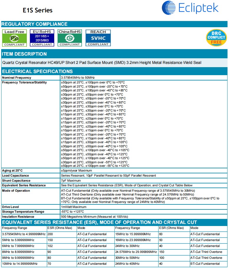 Ecliptek日蝕晶振E1S,E1SJA18-25.000M TR貼片晶振,E1SJA18-6.000M TR,無源晶振,參數圖