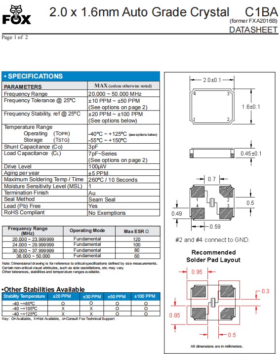 FC1BACBEI50.0-T3|FOX福克斯晶振|2016SMD晶振|50MHz,FC1BACBEI50.0-T3晶振,FOX福克斯晶振,2016mm晶振,進(jìn)口SMD晶振,頻率50MHz,負(fù)載10pf,型號C1BA,耐高溫晶振,抗沖擊晶振,汽車空調(diào)控制板晶振,汽車動力轉(zhuǎn)向控制器晶振,汽車音箱控制器晶振,5G室外基站控制器晶振.
