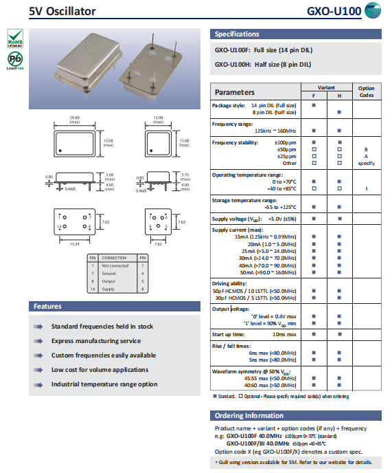 GXO-U100F/BI 40.0MHz-歐美Golledge晶振-四腳插件晶振,參數圖
