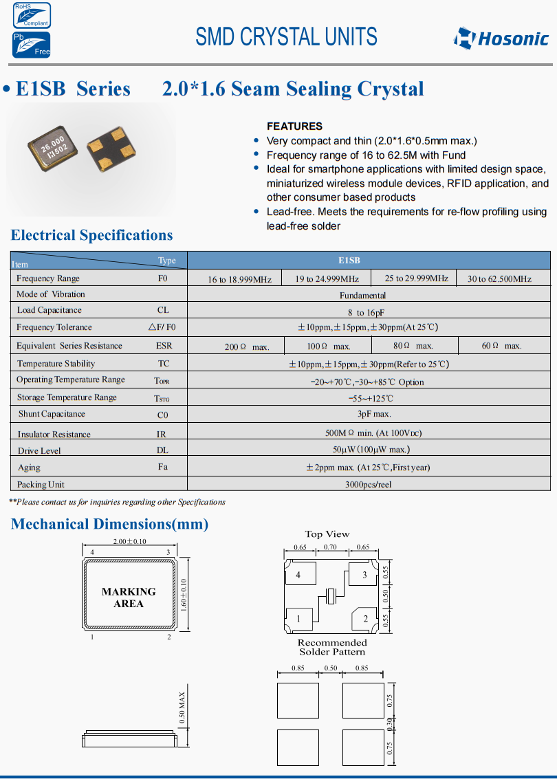 臺產鴻星晶振,E1SB16E000004E晶振,遙遙領先的6G路由器晶振,臺灣鴻星晶振公司,特點:非常緊湊,非常薄(最大2.0 *1.6*0.5mm),頻率范圍為16至62.5M,非常適合設計空間有限的智能手機應用,小型化無線模塊設備,RFID應用和其他消費類產品。滿足使用無鉛焊料的回流剖面要求。無源晶振,貼片晶振,小尺寸晶振,2016晶振,環保無鉛晶振,高精度晶振,無人機高清攝像模塊晶振,北斗衛星定位模塊晶振。
