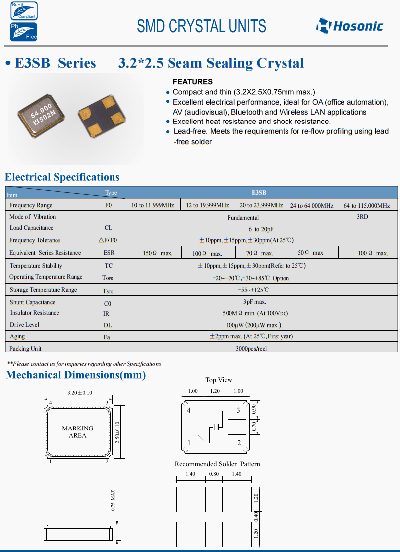 | E3SB12E00003ZE | Hosonic晶振 | E3SB | 12 MHz | ±20ppm | ±20ppm | 16pF | -40°C ~ 85°C |