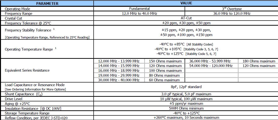 標準3.2毫米x 2.5毫米玻璃密封包,無鉛終止完成,頻率范圍12 - 40 MHz基本,36 - 120 MHz第三泛音,頻率公差;±20 ppm,±30 ppm和±50 ppm,頻率穩(wěn)定度、參考訂購信息,操作溫度,-40°C +125°C標準,磁帶和卷軸包裝標準,eia - 481,通過無鉛認證符合歐盟指令2011/65 /歐盟.