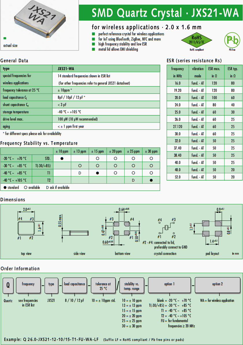 | Q 26.0-JXS21-12-10/10-FU-WA-LF | Jauch晶振 | JXS21-WA | 26MHz | ±10ppm | 12pF |