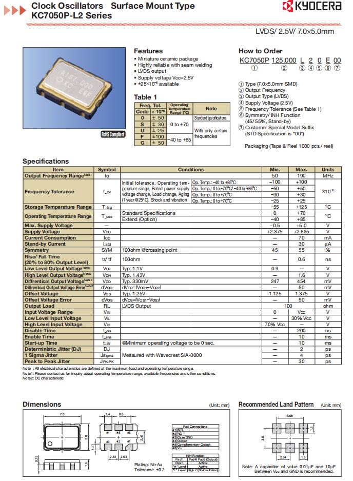 | KC7050P125.000P30E00 | AVX Corp/Kyocera Corp | KC7050P-P3 | 125MHz | 3.3V | 0°C ~ 70°C |