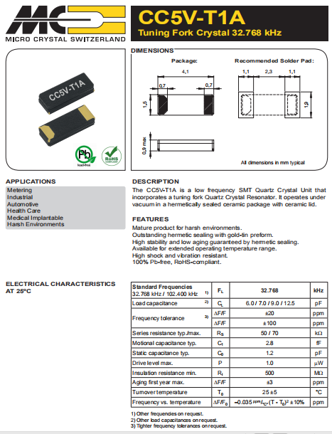 1.CC5V-T1A是一種低頻SMT石英晶體單元結合了一個音叉石英晶體諧振器,它在真空環境下工作,采用密封陶瓷包裝與陶瓷蓋