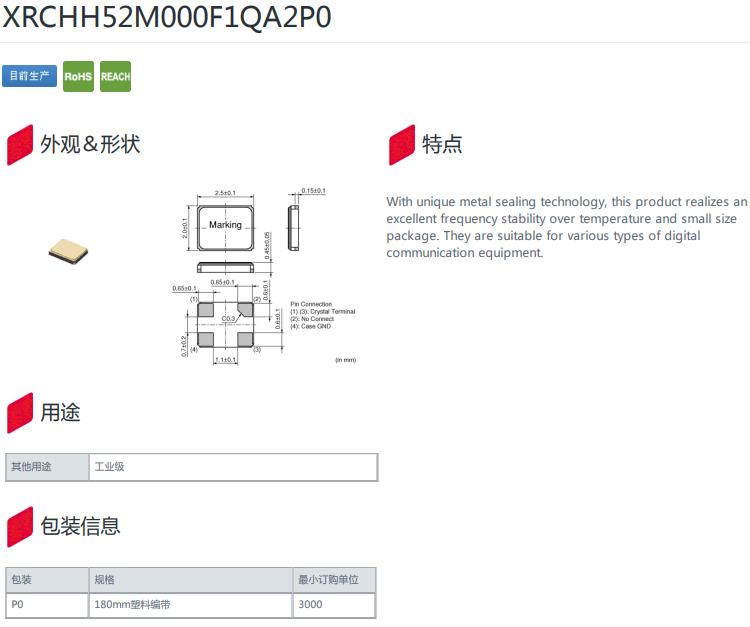 XRCHH52M000F1QA2P0|52M|-30~85℃|10ppm|8pf ,XRCHH52M000F1QA2P0晶振,頻率52M,工作溫度-30~85℃,精度10ppm,負載8pf,2520mm小體積晶振,金屬密封包裝晶振,數字通信設備晶振,醫療設備晶振,智能家具晶振,藍牙模塊晶振.