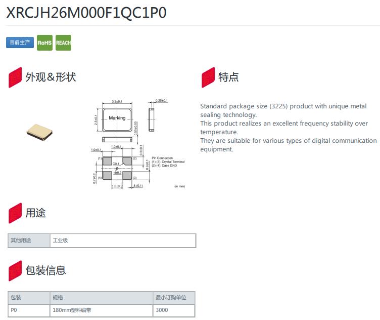 XRCJH26M000F1QC1P0|26MHz|-30~85℃|8pf|3225,編碼XRCJH26M000F1QC1P0,型號為TAS-3225J,頻率26MHz,工作溫度-30~85℃,負載8pf,尺寸大小3225mm,數(shù)字通信設備晶振,5G室外基站晶振,工業(yè)設備晶振,無線通訊設備晶振.