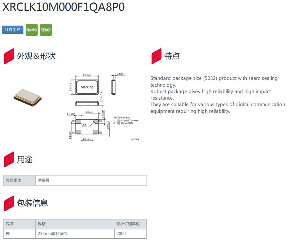 XRCLK10M000F1QA8P0|10MHz|-30~85℃|8pf|5032mm,XRCLK10M000F1QA8P0晶振,頻率10MHz,工作溫度-30~85℃,負(fù)載8pf,尺寸5032mm,高可靠性晶振,無(wú)線通訊設(shè)備晶振,WIFI晶振,通信設(shè)備晶振,數(shù)碼相機(jī)晶振,醫(yī)療設(shè)備晶振.
