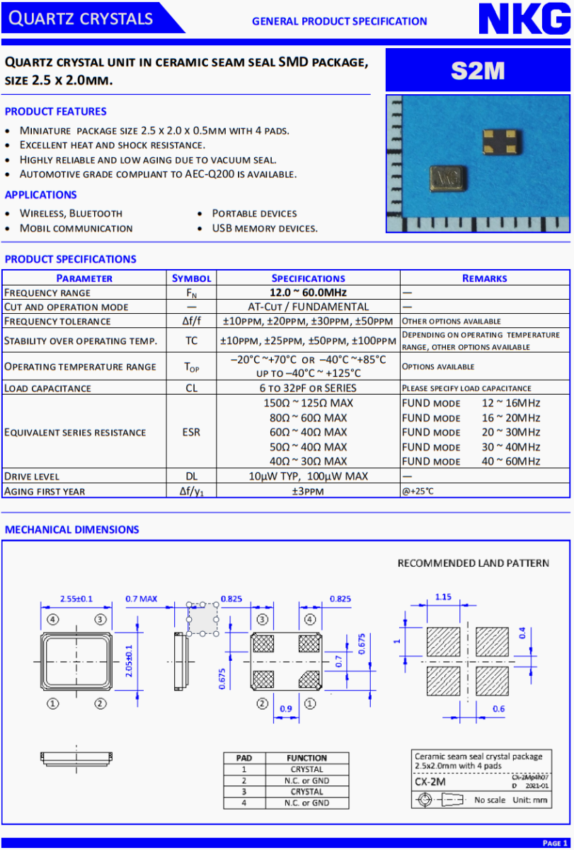 NKG汽車晶體,S2M48.0000F16M23-EXT環(huán)保晶振,液晶儀表盤晶振,NKG晶振公司,無源晶振,貼片晶振,超小型晶振,2520晶振,液晶儀表盤晶振,石英晶振,耐高溫晶振,汽車多媒體設(shè)備晶振,6G通訊設(shè)備晶振,6G網(wǎng)絡(luò)終端晶振,無源晶振,貼片晶振。石英晶體單元在陶瓷縫密封SMD封裝,尺寸25. x 2.0mm。產(chǎn)品特點:微型包裝尺寸2.5 x 2.0 x 0.5mm,有4個襯墊。優(yōu)異的耐熱性和抗震性。真空密封,可靠性高,老化率低。符合AEC-Q200標(biāo)準(zhǔn)的汽車級產(chǎn)品可供選擇。應(yīng)用范圍:無線、藍(lán)牙、移動通訊、便攜設(shè)備、USB存儲設(shè)備