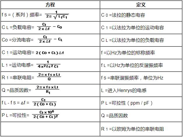 等效電路(如圖A所示)描述了以其固有諧振頻率工作的石英晶體單元的電活動。并聯電容(Co)表示晶體電極的電容加上支架和引線的電容。R1,C1和L1構成晶體的“運動臂”,并被稱為運動參數。運動電感(L1)代表晶體單元的振動質量。運動電容(C1)代表石英的彈性,電阻(R1)代表石英內發生的體積損失。 有用的方程: 運動阻力: