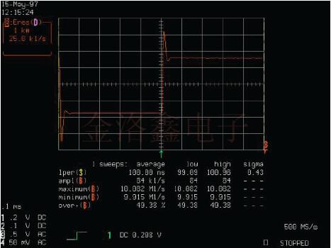 請注意,PLL的頻率(垂直軸)顯示出50%的過沖.這種稍微欠阻尼的響應(yīng)是一種折衷,可以實(shí)現(xiàn)更快的壓擺率容限和適中的捕獲范圍.LeCroy示波器可以通過多種方式用于PLL測量.現(xiàn)代的高性能微處理器通常使用內(nèi)部PLL來倍增系統(tǒng)時(shí)鐘頻率.制造商指定系統(tǒng)時(shí)鐘允許的最大周期到周期的變化.典型的規(guī)格是最大抖動峰峰值小于250ps.由于無法訪問PLL的輸出,因此重要的是系統(tǒng)時(shí)鐘輸入必須滿足此規(guī)范.工程師可以使用Jitter Track逐周期測量系統(tǒng)時(shí)鐘來驗(yàn)證系統(tǒng)時(shí)鐘是否符合此規(guī)格.如圖3所示.在100us記錄中,最大周期與周期周期之差為70ps.可直接從Jitter Track周期讀取該值,以在軌跡C中循環(huán)波形.垂直參數(shù)光標(biāo)之間的區(qū)域標(biāo)記為最大值.跡線A是所采集數(shù)據(jù)的縮放擴(kuò)展,顯示了兩個(gè)具有最大差異的相鄰周期.跡線B是Jitter Track周期,它讀取時(shí)鐘波形每個(gè)周期的絕對周期.