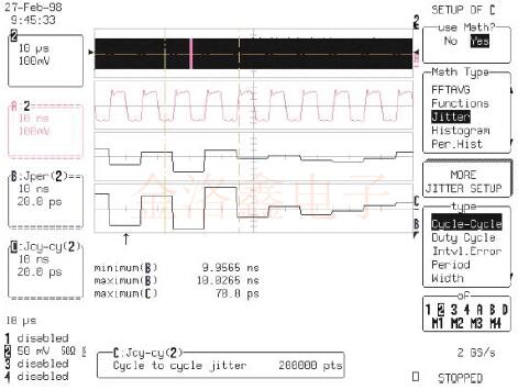工程師可以使用Jitter Track逐周期測量系統(tǒng)時(shí)鐘來驗(yàn)證系統(tǒng)時(shí)鐘是否符合此規(guī)格.如圖3所示.在100us記錄中,最大周期與周期周期之差為70ps.可直接從Jitter Track周期讀取該值,以在軌跡C中循環(huán)波形.垂直參數(shù)光標(biāo)之間的區(qū)域標(biāo)記為最大值.跡線A是所采集數(shù)據(jù)的縮放擴(kuò)展,顯示了兩個(gè)具有最大差異的相鄰周期.跡線B是Jitter Track周期,它讀取時(shí)鐘波形每個(gè)周期的絕對周期.