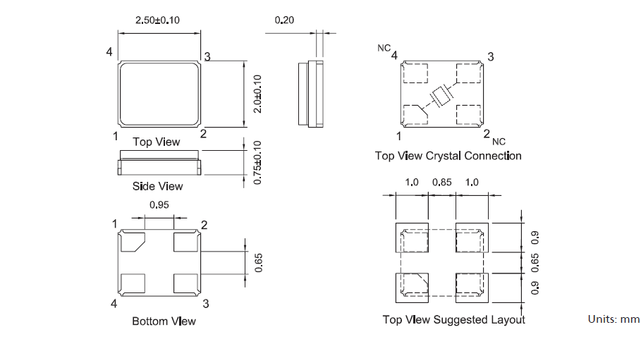 7S-24.000MAHE-T|-40~85°C|24MHz|2520mm無源晶振 尺寸圖