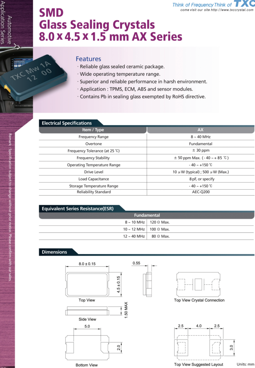 汽車導(dǎo)航系統(tǒng)晶振,TXC臺產(chǎn)晶體,AX-33.333MAGQ-T晶振,臺灣TXC晶振公司,汽車級晶振,無源晶振,車載USB晶振,高精度晶振,耐高溫晶振,高品質(zhì)晶振,臺產(chǎn)晶振,8045晶振,貼片晶振,陶瓷面晶振,二腳晶振,AX系列貼片玻璃密封晶體,8.0 x4.5 x 1.5毫米。特點(diǎn).可靠的玻璃密封陶瓷封裝。.工作溫度范圍寬。.惡劣環(huán)境下性能優(yōu)越、可靠。·應(yīng)用領(lǐng)域:TPMS,ECM,ABS和傳感器模塊。-不受RoHS指令限制的密封玻璃中含有鉛