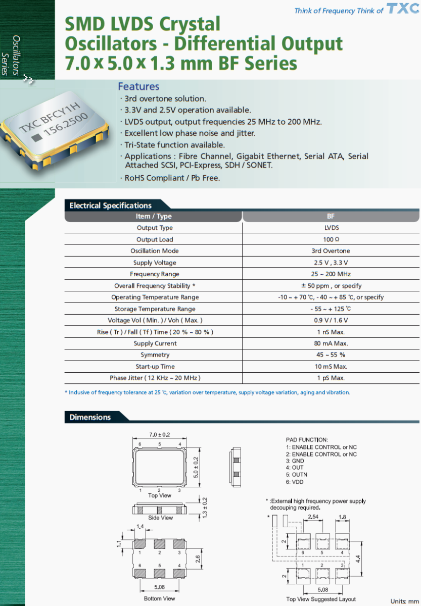 近地衛星晶振,臺灣TXC晶振,BF-62.500MCE-T晶振,臺灣TXC晶振公司,晶技晶振,高品質晶振,石英晶體振蕩器,差分晶振,有源晶振,LVDS晶振,低相噪晶振,低抖動晶振,高精度晶振,環保無鉛晶振,汽車晶振,航空航天晶振,空間站晶振。BF系列SMD LVDS晶體,振蕩器-差分輸出,7.0 x 5.0 x 1.3 mm ,具有0.3次諧波解決方案。3.3 v和2.5V操作可用。LVDS輸出,輸出頻率25mhz ~ 200mhz。出色的低相位噪聲和抖動。三態功能。應用:光纖通道,千兆以太網,串行ATA,串行,附加SCSI, PCI-Express, SDH / SONET。符合RoHS標準/無鉛。