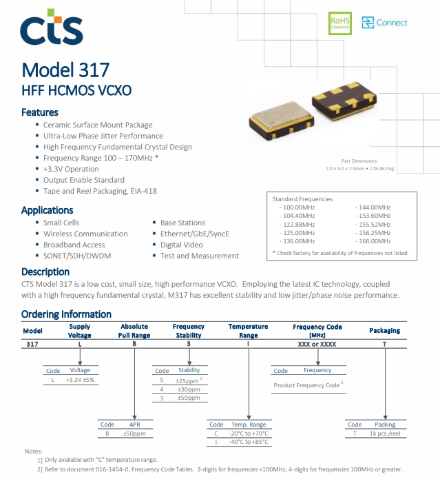 | 317LB3I1660T | CTS | 317 | VCXO | 166 MHz | HCMOS | 3.3V | ±50ppm |