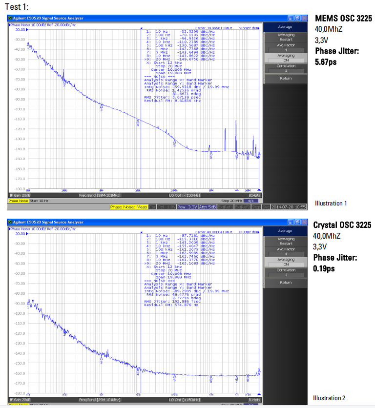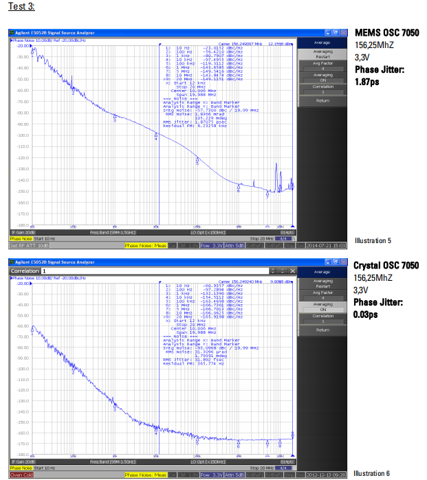| 6. Phase noise | Crystal OSC is better as MEMS OSC (pls, refer to “test data”) | ||