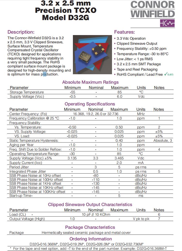 Connor-Winfield D32G是3.2x 2.5 mm, 3.3 V表面掛載、溫補晶振(TCXO)為應用而設計要求高度的頻率穩定性一個非常小的包裹。的RoHS兼容的表面安裝包專為高密度安裝而設計適合批量生產。