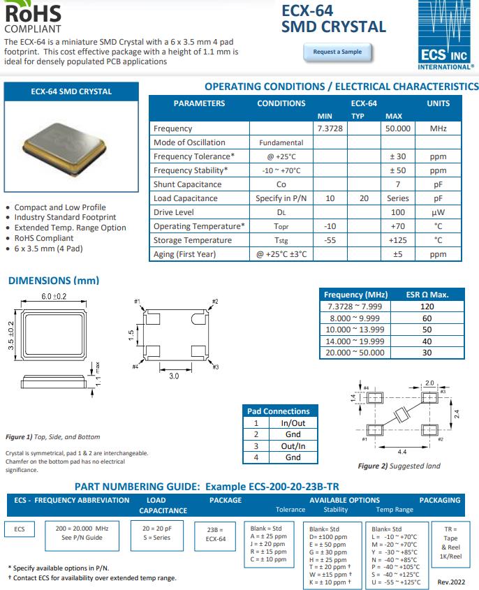 編碼ECS-250-18-23B-F-TR,型號(hào)ECX-64是一種小型SMD晶振,石英諧振器,具有6.0x 3.5mm4襯墊足跡。頻率25MHz,頻率容差±30ppm,負(fù)載電容18pF,腳位4-SMD,這種具有成本效益的封裝高度為1.1毫米適合人口密集的PCB應(yīng)用,