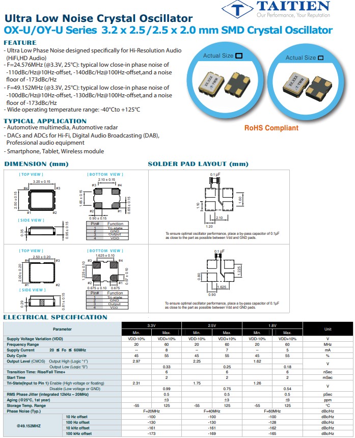 超低噪聲晶體振蕩器 OX-U/OY-U系列3.2 x 2.5/2.5 x 2.0毫米SMD晶振,專為高分辨率音頻(高保真、高清音頻)設計的超低相位噪聲,寬工作溫度范圍:-40 至 +105°C,特征: