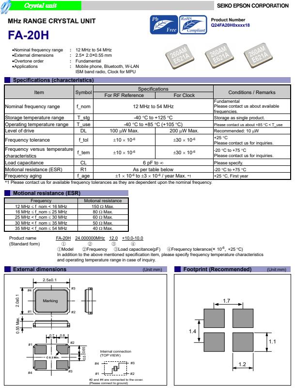 | Q24FA20H0059400 | 2.5 x 2 x 0.55mm | FA-20H | 24.000000 MHz | 8 pF | +/-30 ppm | +/-30 ppm |