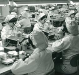圖2:音叉晶體單元的頻率調節過程1970年代初期,音叉晶體單元的頻率調節過程.此圖顯示了工作中的婦女使用金剛石砂輪手工切割音叉晶體單元的前邊緣,以調節頻率.