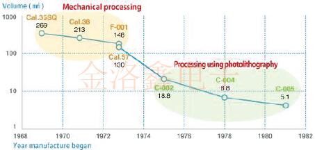 美國一家名為Statek Corporation的公司是世界上第一家成功將光刻技術應用于晶體單元制造的公司.得知這一消息后,服部一郎(當時的SuwaSeiko的公司董事)立即飛往美國.在那里,他被告知了該技術的實施情況,當他回到日本時,他立即命令研發部工作.將這種技術發展付諸實踐.