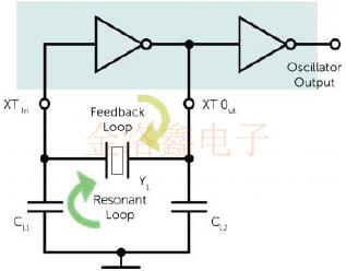 利用具有較低增益裕度[GM]的振蕩器設(shè)計(jì)的高級(jí)IoT芯片組需要具有低等效串聯(lián)電阻[ESR]和低電鍍電容[C0]的晶體,以確保在較寬的溫度范圍和較低的電池功率水平下快速啟動(dòng).許多芯片組[MCU,FPGA和SOC]的RF功能或時(shí)序模塊使用片上Pierce振蕩器配置來生成參考時(shí)鐘頻率.通常,該模塊是一個(gè)反相器放大器,該驅(qū)動(dòng)器通過添加一個(gè)外部石英晶體諧振器[Y1]和兩個(gè)負(fù)載電容器[CL1,CL2]來驅(qū)動(dòng)諧振回路,如圖1所示.可以包括一個(gè)附加的反饋電阻以幫助穩(wěn)定直流工作點(diǎn). 使用芯片組制造商提供的反相放大器的跨導(dǎo)值,可以計(jì)算出由放大器反饋環(huán)路和晶振諧振環(huán)路完成的參考時(shí)鐘的增益裕度GM.參見圖1.為在所有環(huán)境條件下保證晶體諧振電路的正常工作,增益裕度GM[或安全系數(shù)]至少應(yīng)大于3.0,目標(biāo)目標(biāo)應(yīng)大于5.0.