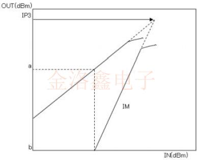 主信號輸出電平和互調(diào)輸出電平的直線相交的點稱為三階交調(diào)點(IP3).實際上,它會飽和到一定的水平,因此線條不會彼此相交,而要點是,直線區(qū)域不會按原樣飽和,如果水平升高,則會相交.