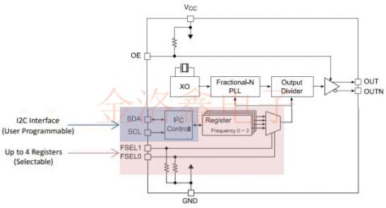 該石英晶體振蕩器系列由SPXO,小數N分頻PLL,LVPECL輸出緩沖器和輸出使能組成.可選選項最多具有4個其他寄存器,這些寄存器是預編程的或用戶可編程的,用戶可以從中選擇.用戶可編程選件具有I2C控制塊,可根據需要對頻率進行重新編程.