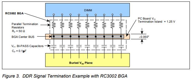 圖3展示了將雙通電容器集成到BGA部件中的優勢。設計人員應在頂部PCB層上安裝0.050“寬的VTT端接島,以優化印刷電路板(PCB)布局和布線。VSS平面位于下埋PCB層,如果可能,應該沒有插槽。