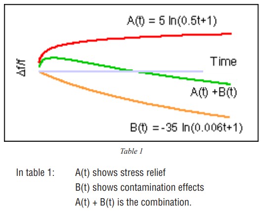 當(dāng)施加應(yīng)力時,石英晶體會改變頻率。這種壓力可以來自于任何一種或所有的幾種來源。封裝和安裝,環(huán)氧樹脂連接,金屬薄膜,和石英本身可以是應(yīng)力的來源。如果應(yīng)力在該部件的使用壽命中是恒定的,則頻率將保持不變。然而,在現(xiàn)實(shí)世界中,壓力會隨著時間的推移而放松,因此,壓力相關(guān)的就會老化。